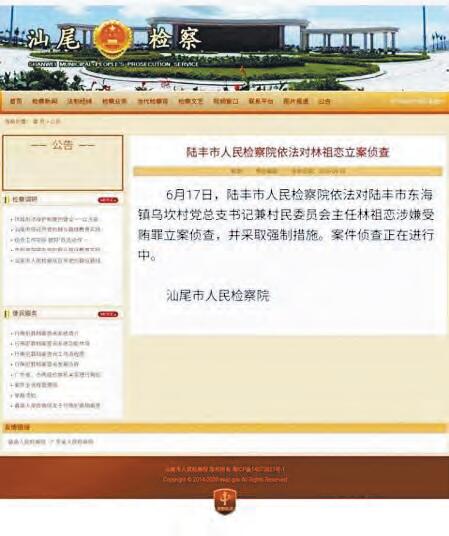 【香港商報網訊】汕尾市人民檢察院網站昨日發布公告稱,17日陸豐市人民檢察院依法對陸豐市東海鎮烏坎村黨總支書記兼村民委員會主任林祖戀涉嫌受賄罪立案偵查,并采取強制措施。案件偵查正在進行中。