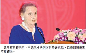 奧爾布賴特表示,兩國在過去40多年中關系突飛猛進。兩國相互了解前所未有,但兩國關系仍面臨困擾和不信任。「有很多人把兩國視作競爭而非合作關系,認為任何使一方獲利的提議必將損害另一方的利益。這也解釋了為何中國對美國的太平洋再平衡戰略有擔憂及美國對中國在南海的活動發出質疑的聲音。」她表示,對此并沒有解決的良方,但只要中美有更深的相互了解、個人間的交流、民間的論壇等活動,就有所幫助。