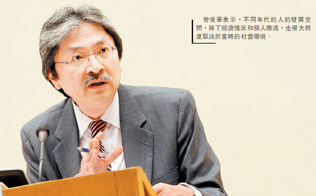 曾俊華表示,不同年代的人的發展空間,除了經濟情况和個人際遇,也很大程度取決於當時的社會環境。他指出,香港回歸前的八、九十年代,多個行業都受惠於國家經濟改革開放而快速擴張,中高層的職位大幅增加;加上有部分人選擇離港或移居海外,間接增加了不少年輕一代向上流動的機會和速度。