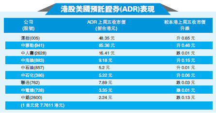 大型藍籌股個別表現向上,匯控(005)ADR收報48.35元,較港股收市升0.65元;港交所(388)收報179.58元,較港股收市升0.38元;中移動(941)收報85.35元,較港股收市升0.45元;騰訊(700)則跌0.18元,收報168.72元。