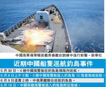 6月18日,中國兩艘海警船進入釣魚島附近海域。