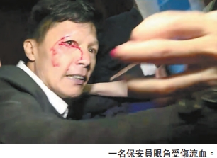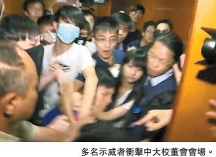 【香港商報網訊】記者戴合聲報道:香港中文大學校董會昨午召開會議,學生會會長周豎峰會前向校長沈祖堯及校董會主席梁乃鵬遞交請願信,要求廢除特首任校監必然制,期間約50名學生及以黑布蒙面的校外人士趁機衝擊會場,與保安員爆發衝突,雙方互相推撞,有保安員眼部受傷流血。