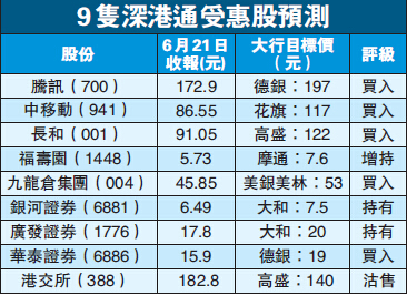 首選是股王騰訊(700),這家科網龍頭總部在深圳,公司業務滲透到內地居民生活的方方面面。最近,騰訊又開始布局手遊行業,從軟銀手中收購了芬蘭手遊巨頭Supercell的大部分股權。市場預計Supercell在股份出售時,估值可能超過90億美元。友達資產管理董事熊麗萍指,騰訊將會受到南下資金的喜愛,特別是一些機構投資者,可上望200元,止蝕價為150元。