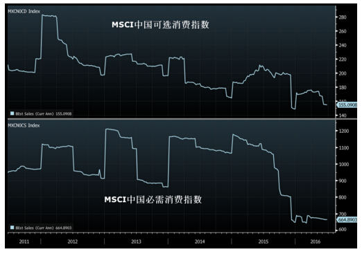 從市場表現來看,迄今為止推動經濟向消費驅動轉型的故事并未讓投資者買賬。MSCI中國可選消費指數在過去12個月下跌32%,MSCI中國必需消費指數同期跌幅也達到29%,損失雙雙超過了MSCI中國指數。彭博匯總的數據還顯示,分析師們過去5年對未來12個月中國消費行業的營收預期也在不斷下調。