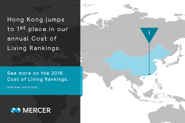 人力資源諮詢機構美世發表「2016環球生活成本指數」調查,本港超越位於安哥拉的羅安達,成為全球生活成本最昂貴的城市,蘇黎世和新加坡仍然分別佔據著第三及第四位,而東京則較去年上升六位,排名第五。