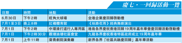 【香港商报网讯】记者米雪尔、何加祺报道:今年是香港回归祖国19周年,香港各界庆典委员会及各大团体於全港各区筹备逾210项活动,预计可吸引和动员逾30万市民参与。今年的「七·一」庆回归系列活动主题为「欢欣分享迈进」,重点活动则为《丝路花雨》经典舞剧演出,於7月1日起一连三晚在红磡体育馆演出。庆委会执行主席郑耀棠在记者会上表示,今年的「七·一」庆回归系列活动主题为「欢欣分享迈进」,希望与大家共同分享庆回归的喜悦,继续发扬港人刻苦耐劳、勤奋拼搏、自强不息的「狮子山」精神,放下政治争拗,为香港注入更多正能量。