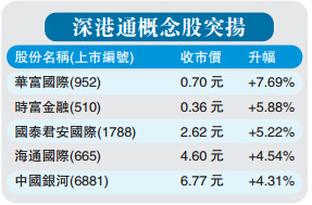 市传港交所再邀请市场参与者测试「深港通」系统,港交所收市升1.9%报186.3元。券商股亦走高,HTSC(6886,华泰证券)、中信证券(6030)、海通证券(6837),以及中国银河(6881)普遍升2%至5%。