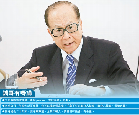 原題:李嘉誠倡劃一加利得稅 改善貧富懸殊問題