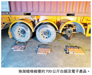 海关表示,关员於上周五早上监控一辆从落马洲管制站入境的货柜车,发现货柜车驶进元朗一个货场卸下原有拖架,再拖走另一拖架,关员见时机成熟搜查货场,检获刚从拖架车轴暗格内卸下的700公斤白银,又在暗格内搜出2640个电脑中央处理器。