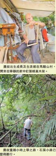 乘上往馬鞍山村的專線,一說要找廣叔,司機很熟悉地在半山馬鞍橋停下,指着有農場名字的寮屋,說「這里就是」。近年在養蜂的廣叔正為蜂做巢,很細心地釘制木架,四周環境寧靜,只聽見「叮、叮」的聲音,和風輕拂下,廣叔向記者訴說他此生的夢想。