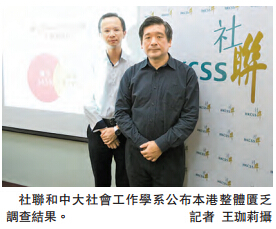首席研究员、香港中文大学社会工作学系副教授黄洪称,市民在医疗和社交生活的匮乏状况较为严重,33.7%受访市民在经济上无法负担「定期检查牙齿」,12.7%及8%市民无法负担「患病时看私家医生」及「患病时向中医求诊及购买处方药物」;在社交生活方面,12.8%受访者无法在「每一个月与朋友或家人参与余暇活动」,认为社交生活的匮乏情况值得关注。