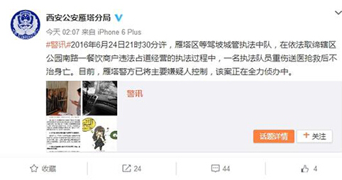 另据法制晚报消息,6月25日凌晨,陕西省西安市公安局雁塔分局通过其官方微博发布消息:昨日晚21时30分许,雁塔区等驾坡城管执法中队,在依法取缔辖区公园南路一餐饮商户违法占道经营的执法过程中,一名执法队员重伤送医抢救后不治身亡。