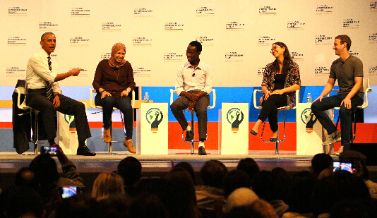 当地时间6月24日,美国总统奥巴马(左一)出席在斯坦福大学举办的2016全球创业峰会,与脸书创办人扎克伯格(右一)等青年创业家探讨创新创业。峰会由奥巴马发起,自2010年在美国首都华盛顿首次举办后,分别由土耳其、阿拉伯联合酋长国、马来西亚、摩洛哥和肯尼亚等国政府举办,今年进入第七届。