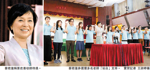 蔡若莲昨日向传媒透露,考虑了1个多月才决定参选,是由於幼稚园老师的薪酬待遇、和资历不受到认可,而激发其参选决心,认为有必要改变幼师的制度。她续称,大约1年前因为要聘请文员,有幼师来应徵,在询问之下,才发现幼师存在不少问题,所以开始关注。