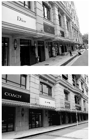 昨日,北京晨報記者來到位于建國門橋附近的中海楓丹公館,看到整個樓盤有五棟樓,呈凹字形。建筑物四周設有30多個大小不一的底商,每個底商頂部都掛著一個看似國際大牌的招牌,既有奢侈品,也有快餐業,顏色鮮艷,十分奪目。就在這些大牌的招牌旁邊,張貼著大幅廣告“黃金旺鋪火爆招商中”。