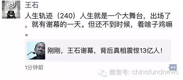 不過王石似乎并沒有“認輸”。他在隨后的一條朋友圈中表示:“人生就是一個大舞臺,出場了,就有謝幕的一天。但還不到時候,著啥子雞嘛(著什么急嘛)。”