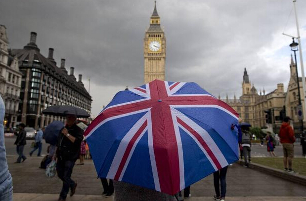 倫敦大本鐘前,一名游客手里的英國國旗樣式雨傘。英國公投退出歐盟的結果已促使英國的科技創業圈重新評估在英國的業務運營。