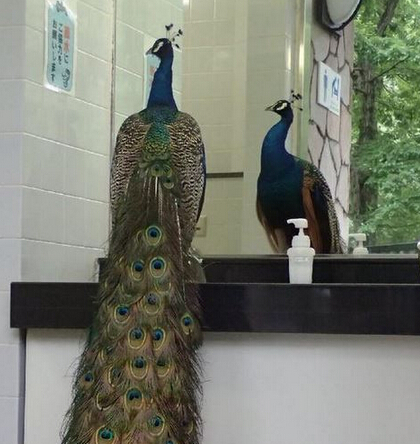 “啊!真是每天都被自己帅醒!”在男生厕所洗手台照镜子的孔雀心中是这样想的吗?日本网友kokosyo在推特PO出2张照片,一只华丽的蓝孔雀站在洗手台上照镜子,一脸认真地端详自己的样貌,长长的羽毛拖到地面,远看还像个衣冠楚楚的古代美男子站在洗手台前,更让网友觉得新奇的是,孔雀还自己找到“男厕”,“真是聪明啊”。