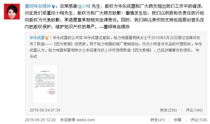 6月26日中午,董明珠自媒體在微博發文致歉,承諾願意承擔相關法律責任,同時將以身作則支持包括音樂在內的版權保護,維護知識產權的尊嚴。