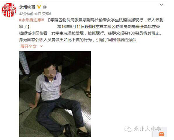 网友@永州铁哥爆料称,湖南永州零陵区物价局副局长张某,在其居住的小区偷窥一未成年女孩洗澡被抓现行。这是他第二次偷看这名未成年女孩洗澡。民原标题:湖南永州一副局长被指再次偷窥未成年女孩洗澡,纪委已立案近日有网友发帖称,6月11日晚,湖南永州市零陵区物价局副局长张某,在其居住的香樟绿城小区偷窥一未成年女孩洗澡被抓现行。6月25日,零陵区委相关负责人向澎湃新闻(www.thepaper.cn)称,纪委对此已立案。