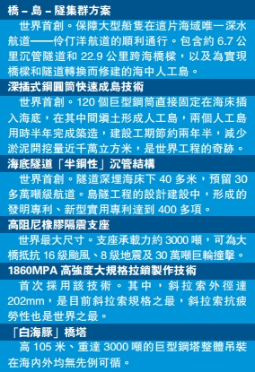 港珠澳大橋主體工程由6.7公里的海底沉管隧道和長達22.9公里的橋梁工程組成,隧道兩端建有東、西兩個人工島。要克服惡劣的外海施工條件,建設一座同時滿足內地、香港和澳門三地標準體系,設計使用壽命長達120年的巨大規模的跨海通道,建設者們創造性地實踐了「大型化、標準化、工廠化、裝配化」的設計理念。