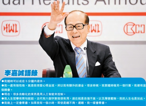 今年7月29日將屆88歲的李嘉誠,被稱為「超人」,花了70年時間將一家塑料花廠打造成價值800億美元的商業帝國。他在訪問中表示,即使沒有他,其商業帝國仍然可以生存,并稱「我隨時可以或在5分鐘內退休。」他表示,仍樂於繼續擔任集團主席,現時每周打高爾夫球兩至三次;若日后退休,不會去釣魚,而是會將更多時間放在李嘉誠基金會。