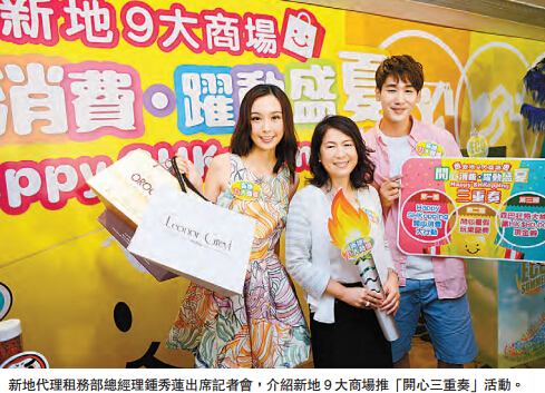 虽然环球经济放缓,市民消费意欲转趋审慎,但新地旗下9大商场包括wtc more世贸中心、Mikiki、将军澳东港城、将军澳中心、上水广场、屯门卓尔广场、荃湾荃锦中心及新领域广场,依然在传统暑假消费旺季推出大型营销活动。新地代理租务部总经理锺秀莲昨午在记者会上表示,9大商场今年首两季人流及营业额均录得8%的平均增长,分别达1.9亿人次及74.7亿元营业额。其中6月商场整体人流及营业额分别升7%及6%,达2965万及11.5亿元。新地将投入1543万元全力推广「Happy SHKopping开心消费跃动盛夏」,预期可於7至8月为9大商场带来6565万人流及28.6亿营业额,较去年增长约6%。