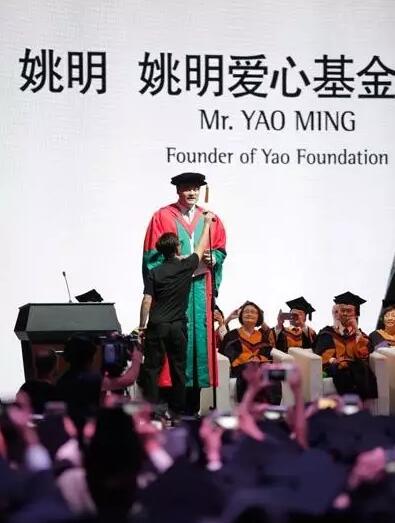 毕业礼现场,姚明起身致辞,他走到话筒前说,“呀,话筒太高了,你们高估了我的身高”。工作人员急忙调整,现场一片笑声掌声。