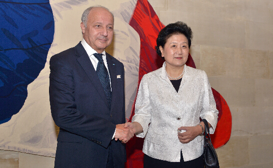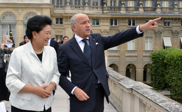 中国国务院副总理刘延东29日在巴黎法国宪法委员会会见法国宪法委会主席法比尤斯。图为法比尤斯(右)陪同刘延东(左)参观法国宪法委员会。
