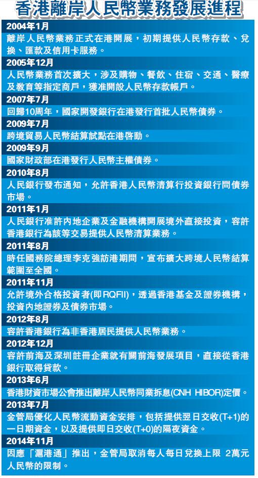 在可见将来,透过允许深圳企业发行境外人境外币债券的门槛,以及放宽进一步前海企业进行跨境人民币融资所得资金的用途,香港在人民币业务获得的机遇,有望呈现「放射式增长」。