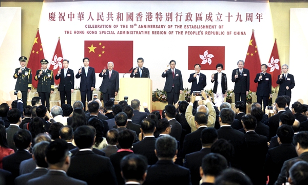7月1日,香港特區政府上午在香港會議展覽中心舉辦酒會,慶祝成立19周年。香港特區行政長官梁振英為酒會主禮。中新社發 譚達明 攝