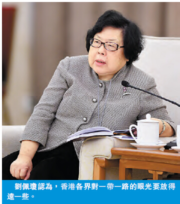 劉佩瓊說:「『一帶一路』概念剛提出來三年,是剛剛起步的時間,香港不可能扮演什麼角色,也不可能主導。香港可以發揮的優勢和作用,特別是在國際協作和金融方面發揮作用。香港各界,包括商界、專業界、金融界的眼光要放得遠一些,去認識和了解沿線國家的具體情況、現在的實力和將來發展潛力在哪裏,才能找到機會發揮自身作用。例如有些地方很窮,短中期內不可能是產品市場,有些地方可提供勞動力和設廠、有些地方可作為投資自標地等等。」