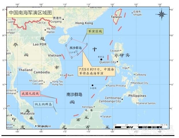 據環球時報報道,7月3日,三亞海事局發布南海海域軍事演習的航行警告。該航行警告稱,自7月5日8時到7月11日8時,在南海相關海域進行軍事活動,禁止船只駛入。