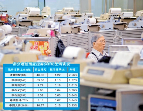 【香港商報網訊】記者莊海源報道:美股連升4日,帶動在美國上市的主要港股預託證券(ADR)價格向好。按比例計算,收報21010點,升215點或1.04%。不過,中證監主席劉士余日前指「深港通」存在技術問題有待解決,可能令「深港通」的憧憬降溫,或影響港股本周走勢。