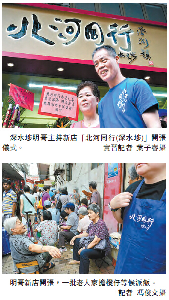 【香港商報網訊】實習記者葉子睿報道:深水埗明哥(陳灼明)因早前位於大南街的「北河點心茶餐廳」被大幅加租,得業主謝林仗義出手,以低於市價租出逾千呎地舖及部分2樓位置,明哥昨日在深水埗大南街另一位置開設新店「北河同行(深水埗)」正式開業。