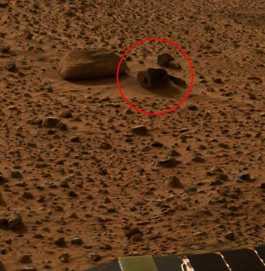 不久前,YouTube用戶Paranormal Crucible宣稱,在美國宇航局“好奇號”火星探測器不遠處,有類似人類的外星人正躲在火星岩石後面監視火星探測器。陰謀論者認為,這塊岩石可能就是擁有15厘米高屋門的外星人居所。