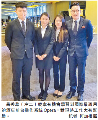 另外兩名應屆畢業生莫家維及呂秀華亦於2月到奧地利旅遊酒店學院交流,學習調酒、品嘗咖啡和芝士等餐桌禮儀和技巧。呂秀華稱,在當地學習調酒的新知識後,回港便以海洋作主題,構思及調出一杯名為「Blue eyes」的雞尾酒。她又說,在IVE學習生涯中,有機會學習到國際最通用的酒店前臺操作系統Opera,故在畢業後便馬上受聘本地的五星級酒店作前臺服務員,月薪達1.5萬元。她說,課堂及交流上都學懂如何與人溝通、接待客人,認為對現時工作有很大幫助。