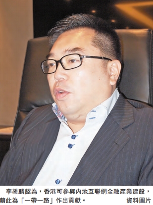談及香港該如何參與「一帶一路」,李鋈麟認為,首先,香港可參與內地互聯網金融產業建設。他說,金融業作為香港的支柱產業,香港具有管理經驗先進、經營模式成熟等優勢,可以憑借內地發展互聯網金融產業的機遇,參與「一帶一路」建設,為鞏固香港人民幣離岸中心地位、加快人民幣國際化進程、促進「一帶一路」沿線國家金融業發展作出貢獻。