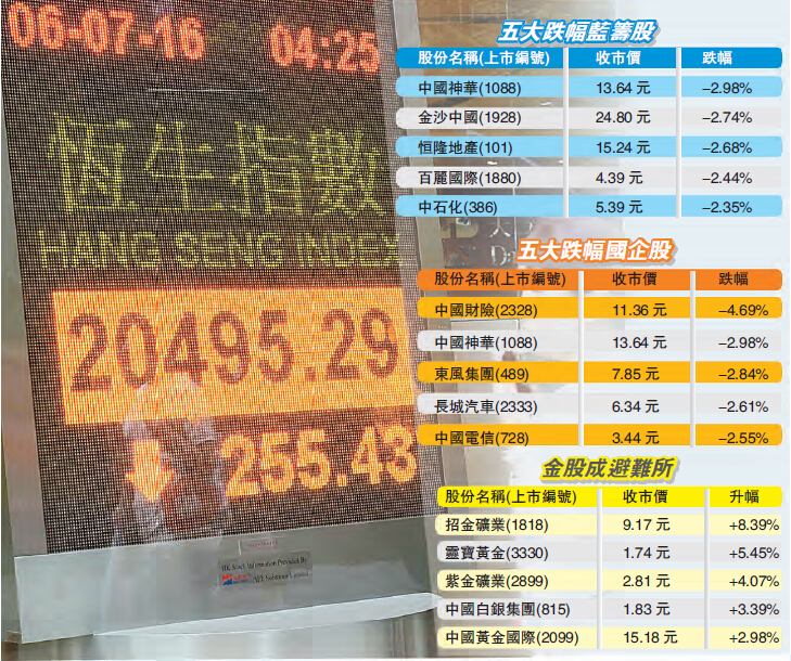【香港商報网訊】記者伍敏報道:鎊匯再創31年新低,英國3只房托基金暫停贖回,脫歐風險乍現,港股昨跟隨區內股市一度跌逾400點,幸尾市跌幅收窄,收跌255點或1.23%,報20495點,100天線(20326點)見支持,國企指數跌1.62%,主板全日成交606億元,資源金屬股續有資金追捧。