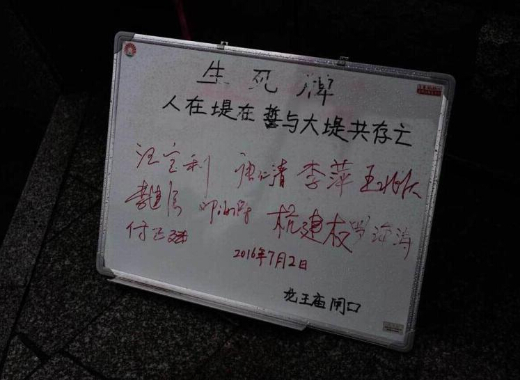 98年抗洪期間,北京青年報記者報道武漢龍王廟閘口旁值守人員立起一塊生死牌,這一事跡感動了全國人民,也讓國博將此牌收藏。18年后抗洪重任再次降下,北青報記者重回龍王廟閘口,再次有一塊生死牌出現在這里:人在堤在 誓與大堤共存亡。而上面再次出現了兩個相同的名字,唐仁清與李建強。據了解,已經50多歲的唐仁清目前是江漢區水政監察大隊隊長,李建強依然是他的同事。抗洪重任再次降下,兩人像18年前一樣,擔起了值守閘口的重任。(文 北青報記者 劉汨)