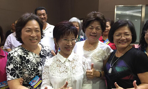 國民黨主席洪秀柱(前左2)上任后首次“移動中常會”6日在南投舉行,洪秀柱會前與地方干部握手致意并合影。(圖:臺灣“中央社”/謝佳珍攝)
