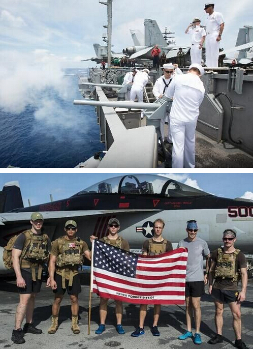 7月4日,美軍士兵等在航行于南海的“羅納德·里根”號航母甲板上舉著星條旗紀念美國獨立日。