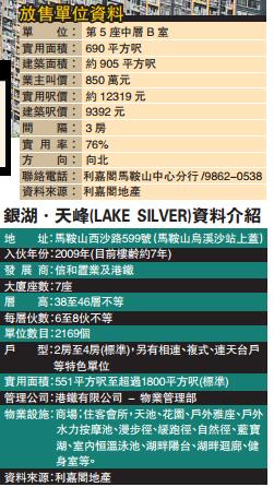 新近一宗成交則為5座低層G室,單位實用面積約699平方呎,建築面積約918平方呎,業主半年前開始以900萬元放售,至近日減價90萬元至810萬元成交,減幅約一成,折合實用呎價約11588元。相比買賣個案,「銀湖‧天峰」租賃成交較多,當中不少為5座單位,例如5座中層H室,早前約15000元月租租出,實用面積約573平方呎,實用呎租約26元。5座高層B室,實用面積約746平方呎,月租21000元,實用呎租約28元。
