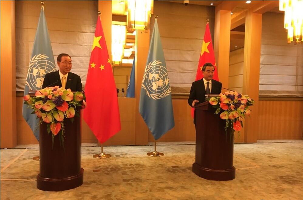 7月7日下午,中国外长王毅与联合国秘书长潘基文一同出席在钓鱼台国宾馆召开的联合记者会,双方就朝核问题、南海问题等地区热点问题交换立场。潘基文称上任以来已有10次访华经历,期待出席杭州的G20峰会;潘基文还赞赏中国支持联合国维和行动。王毅就南海问题表明中方立场,指出,菲方拒绝对话,不利南海问题解决;潘基文称,希望南海争议和平解决。