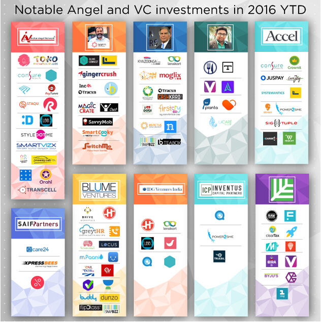 這就是為什么,印度天使網絡已經對外宣布了18筆早期交易。Blume投資了16家初創。塔塔集團掌門人拉坦塔塔仍然像2015年那樣積極投資,今年上半年他投資了14家公司。此外,還有Flipkart的創始人投資了7筆,FreeCharge的創始人投了11筆……下圖為值得注意的印度風投和天使投資人所投資的項目: