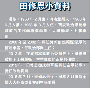 2004年,田修思升任新疆軍區政委,2009年轉任成都軍區政委,2012年升任空軍政委,同年晉升上將軍銜。