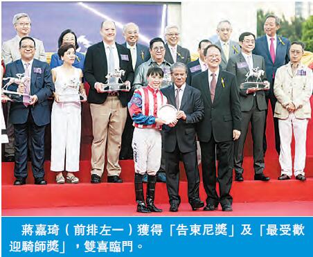 除了本届马季总入场人数再创新高外,更惹人注目的是现年23岁女见习骑师蒋嘉琦,她昨於马季煞科战中策骑「万事欣」及「帝圣之宝」两驹,胜出两场赛事,以全季共胜出37场头马的佳绩,勇夺赞扬全季赢马最多本地骑师而设的告东尼奖,亦获马迷在一人一票的「最受欢迎骑师」选举中,击败出炉两届本港冠军骑师莫雷拉,成为首位胜出的本地骑师,她亦是首位华人夺得该奖。而新一届马季将於本年9月3日开锣。