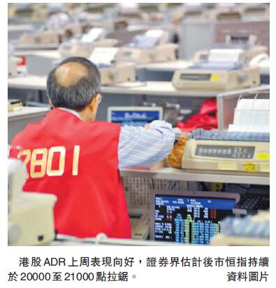 【香港商报网讯】记者伍敏报道:港股在美预托证券(ADR)上周五表现普遍向上,港股ADR升约260点,至20824点。汇控(005)收报47.33元,较港收市升1%;中移动(941)收报88.84元,较港升1.5%。本周包括英国议息及南海仲裁结果等多个不明朗因素影响大市,证券界估计周内恒指持续於20000至21000点拉锯。