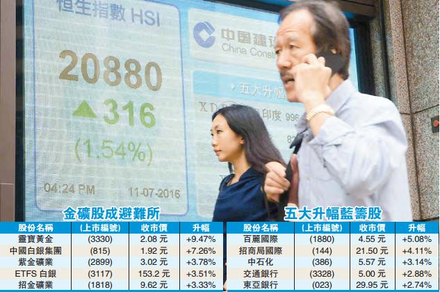 新盤銷售反應踴躍,地產股跑贏大市。新地(016)重上「紅底股」,收報100.1元,升2.4%。新世界(017)升2%。投資者投資黃金避險,金礦股股價繼續上升,其中靈寶黃金(3330)追落后升近一成,紫金礦(2899)升約4%。