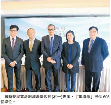 其他新盤昨日亦有不少新動向。麗新發展(488)與新地前主席郭炳湘旗下帝國集團發展的將軍澳南臨海住宅項目,昨日命名為「藍塘傲」,目標最快9月登場。麗新發展高級副總裁潘銳民表示,項目提供605個單位(包括23間獨立屋),間隔由1至4房,標準單位實用面積由300餘平方尺至逾1000平方尺。